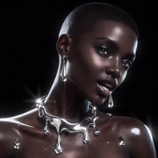 Shudu’s presence is critical because her face and posture anchor the more abstract material experiments. She is never incidental. Even when the reel cuts to a chrome rose or a hand in liquid metal, the surrounding visual world still feels like an extension of her identity. The lighting stays brutally clean: bright, hard specular highlights on chrome, rich skin contrast, and no visible environment beyond darkness. That makes every shot look poster-ready.