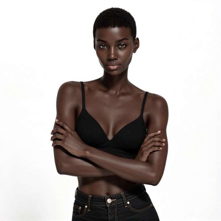 | Wardrobe simplicity | Premium signal via minimalism; keeps focus on face/skin | “black minimal bra” / “neutral tank top” / “strapless bodysuit” |