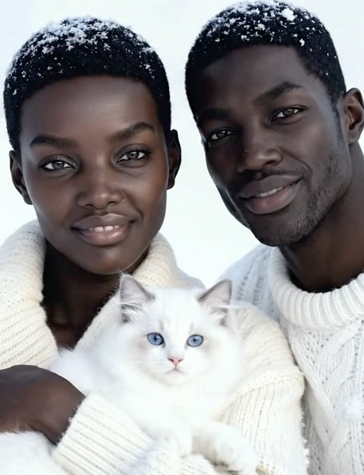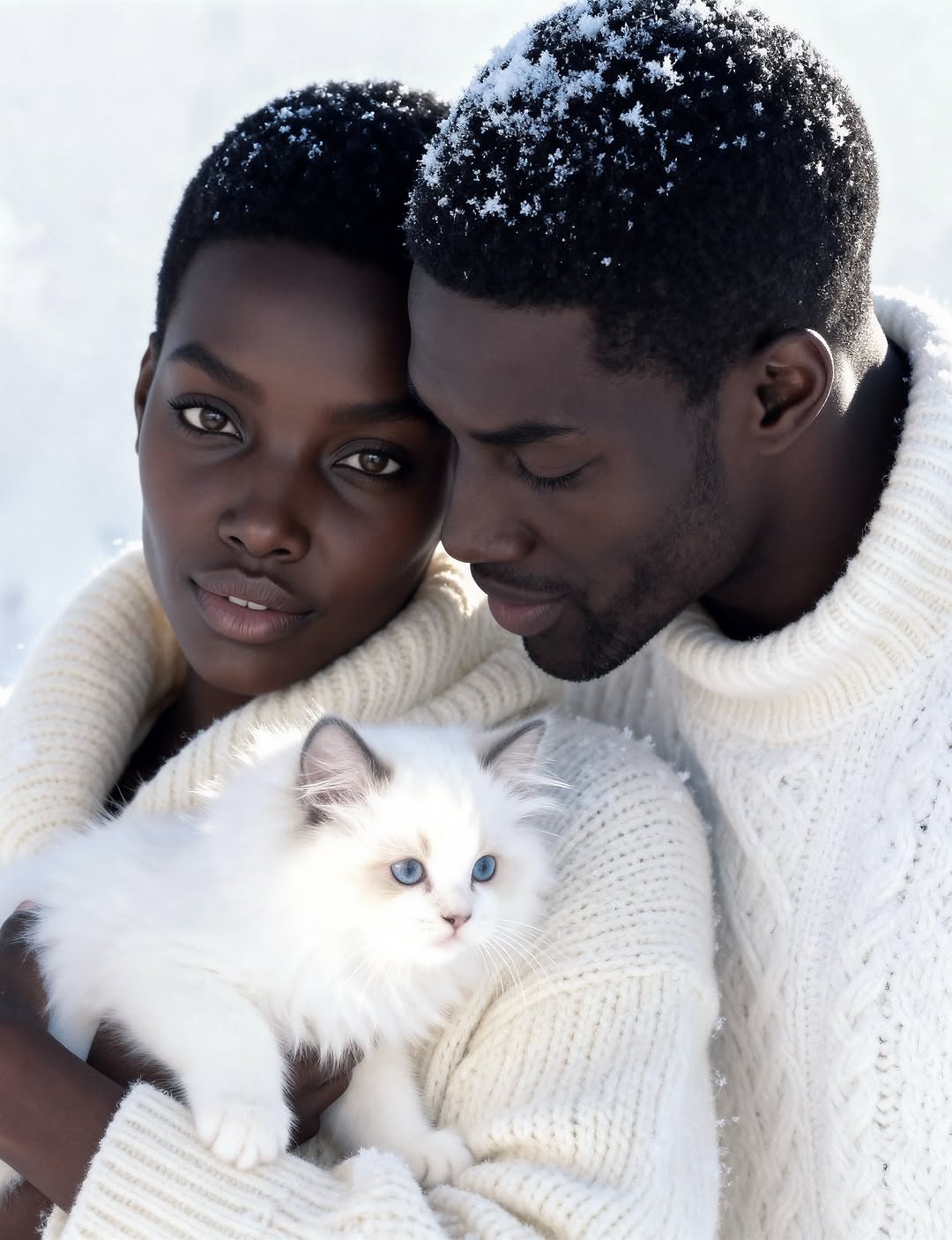 {two close faces} {center pet/object} {single seasonal micro-detail} {soft portrait light}{dual portrait} {knit textures} {plain backdrop} {tight emotional crop}{direct gaze} {pet gaze toward lens} {close framing} {editorial realism}The aesthetic strength here is relational balance. Neither person dominates; the cat acts as a visual bridge between them. The tonal choices are smart: white knitwear links both subjects, and the cat fur extends that brightness into the foreground. Snow on hair introduces seasonality with almost no visual noise. The image also uses soft light to preserve detail in dark skin without losing depth, which is a critical technical win for portrait creators.