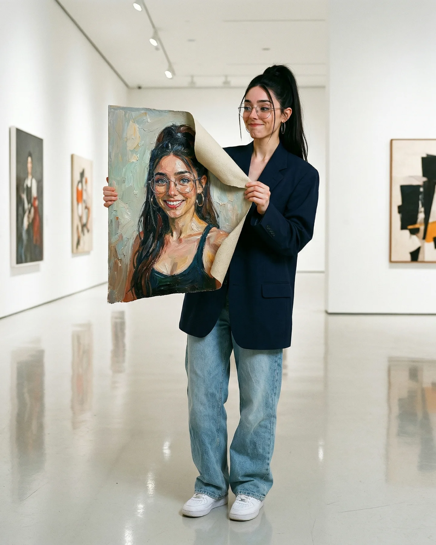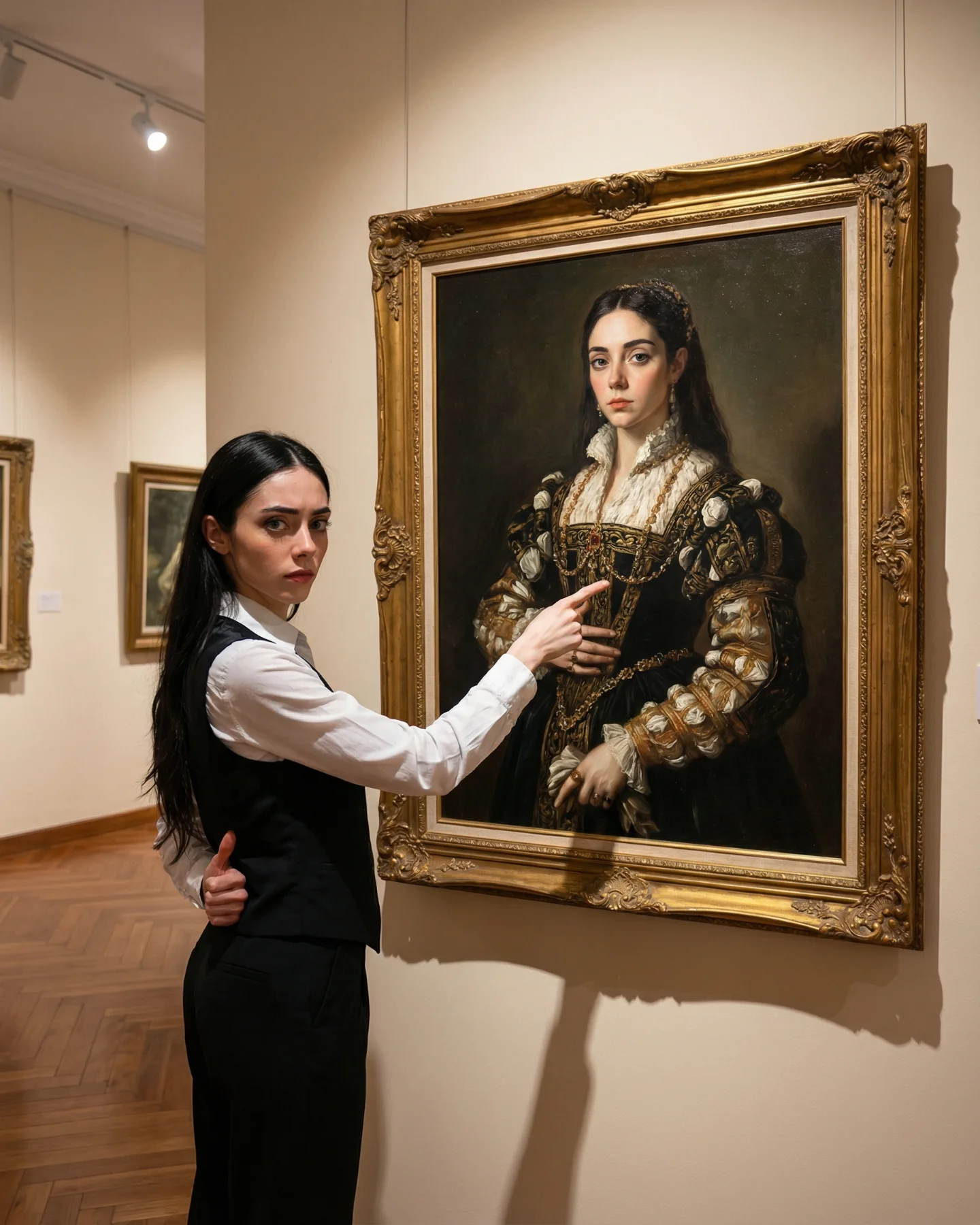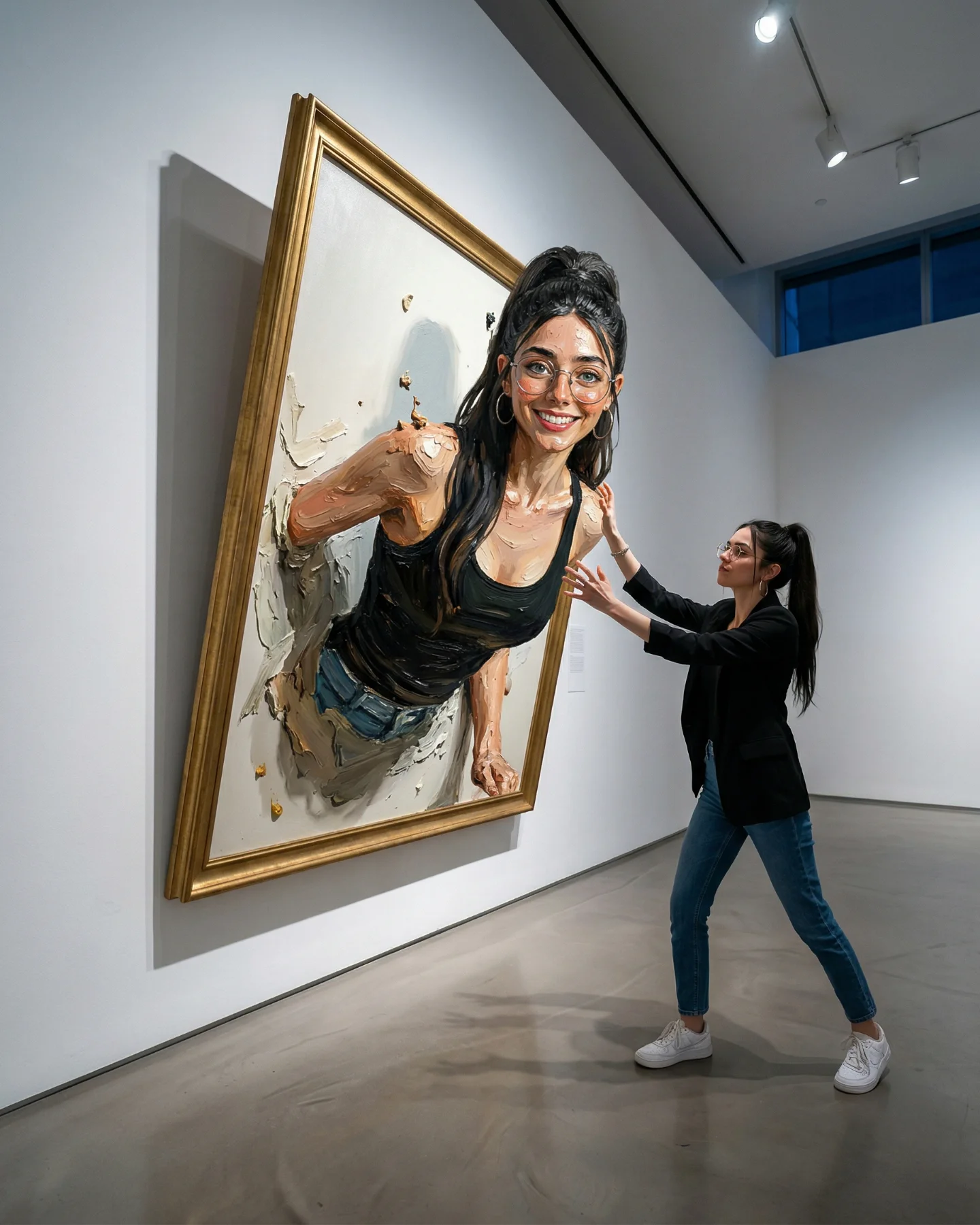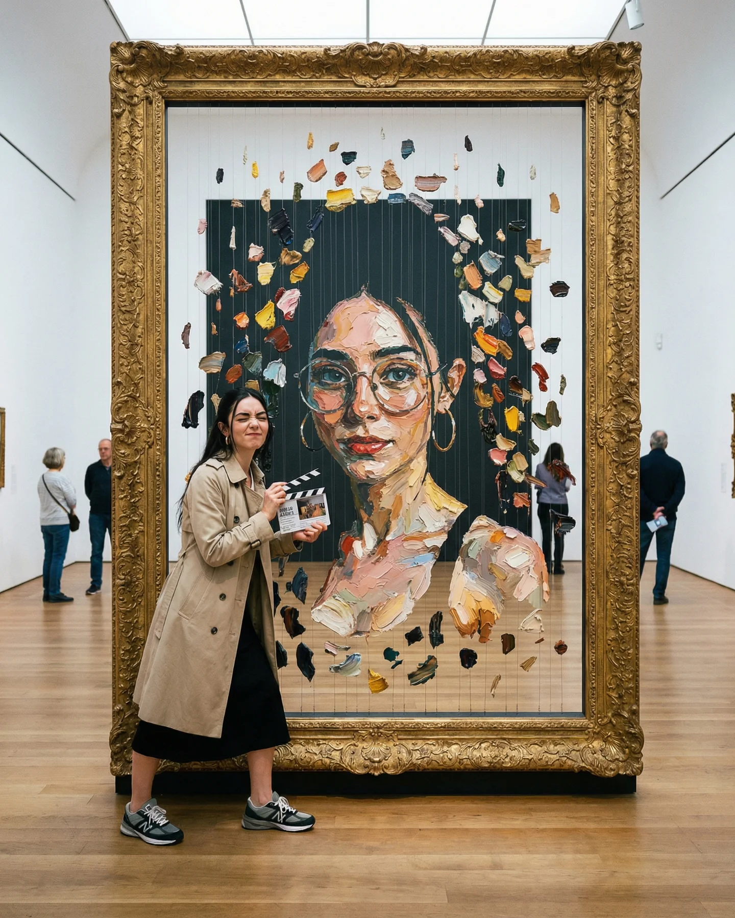 The lighting is another quiet advantage. This is not dramatic studio lighting. It is believable overhead museum light with enough warmth to flatter skin and enough shadow to anchor each figure onto the wall and floor. That realism matters because impossible concepts only work when the surrounding physics feel stable. Even the blurred visitors in the background help; they make the gallery feel occupied and real, which makes the frame-breaking action feel more magical.
