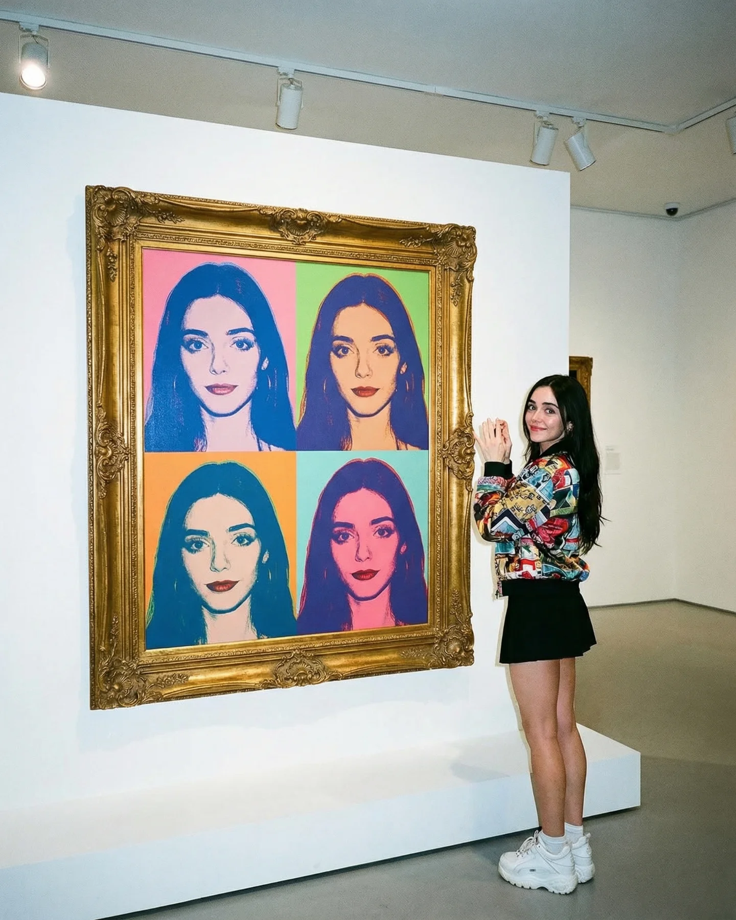 The caption is minimal, but the creative signal is loud. A gray hoodie, a black skirt, white sneakers, and a recognizable gallery setting make the image easy to read in less than a second. Then the eye notices the impossible action: one version stepping out, one version hanging from the frame, one version standing in the middle as if she is the only normal person in the room. That layered reveal creates the replay value. You understand the scene fast, but you still spend another beat checking how the illusion was built.
