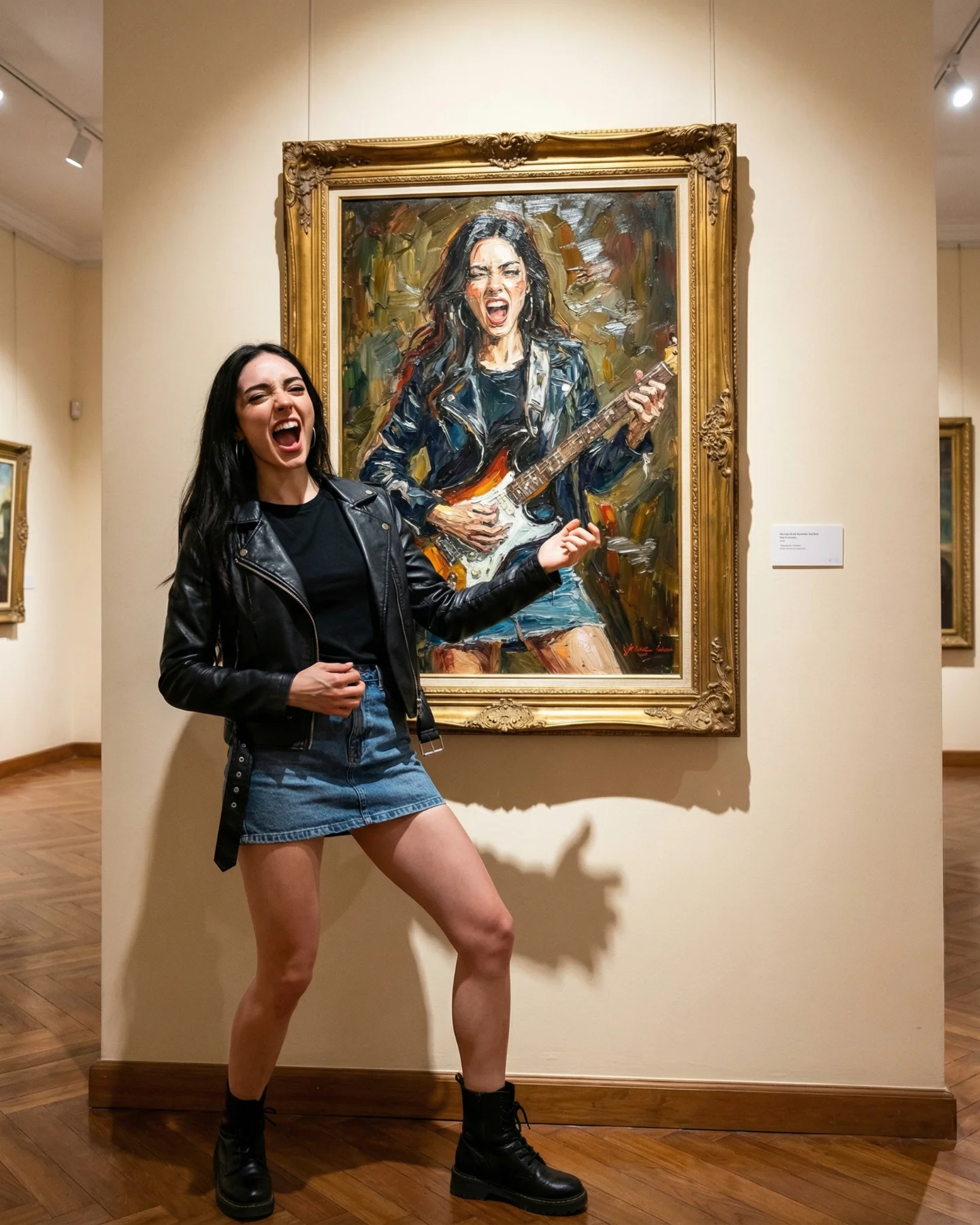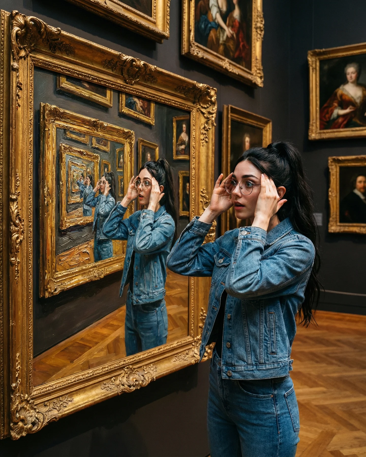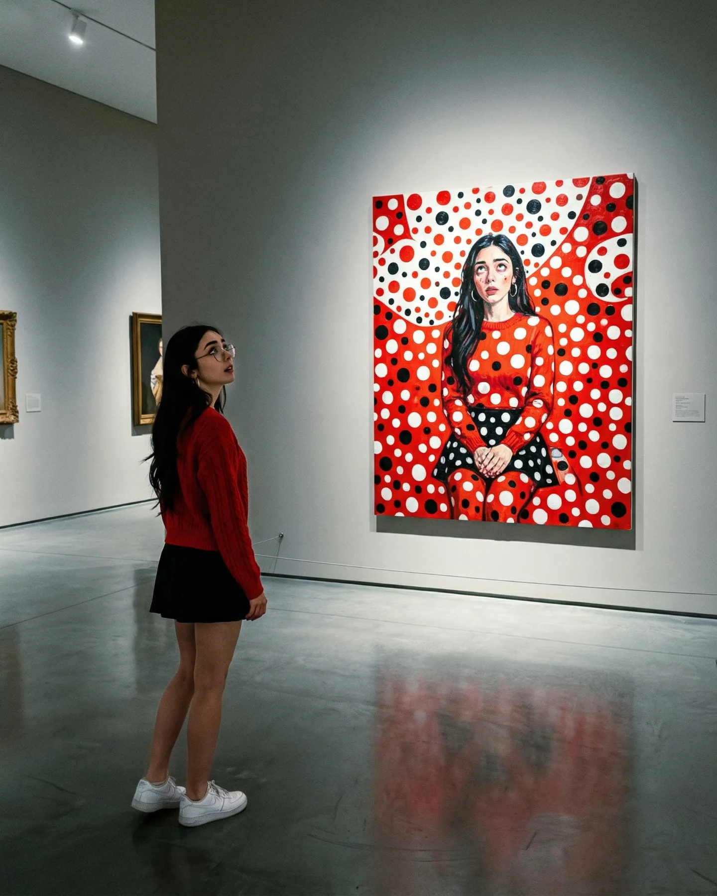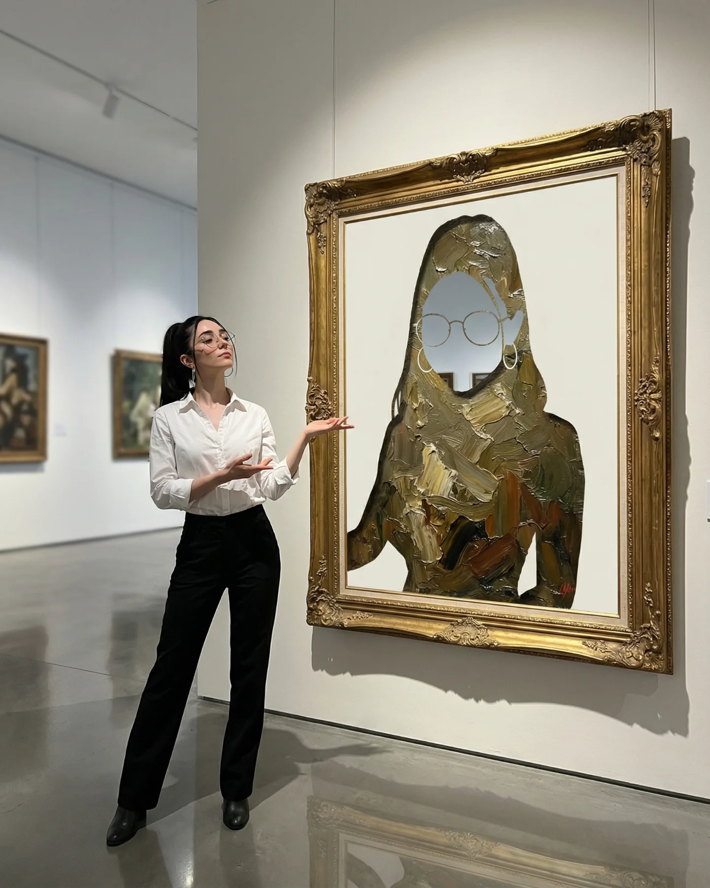 What makes this post shareable is not just surrealism. It is structured surrealism. The outfit is ordinary, the museum is familiar, and the visual trick is easy to retell: “she turned herself into the art.” That sentence is simple enough for comments, repost captions, and creator imitation. The image also gives viewers a built-in participation prompt. If you create AI content, you instantly want to know how to reproduce the frame illusion, how many clones to use, and what text treatment to add on top.