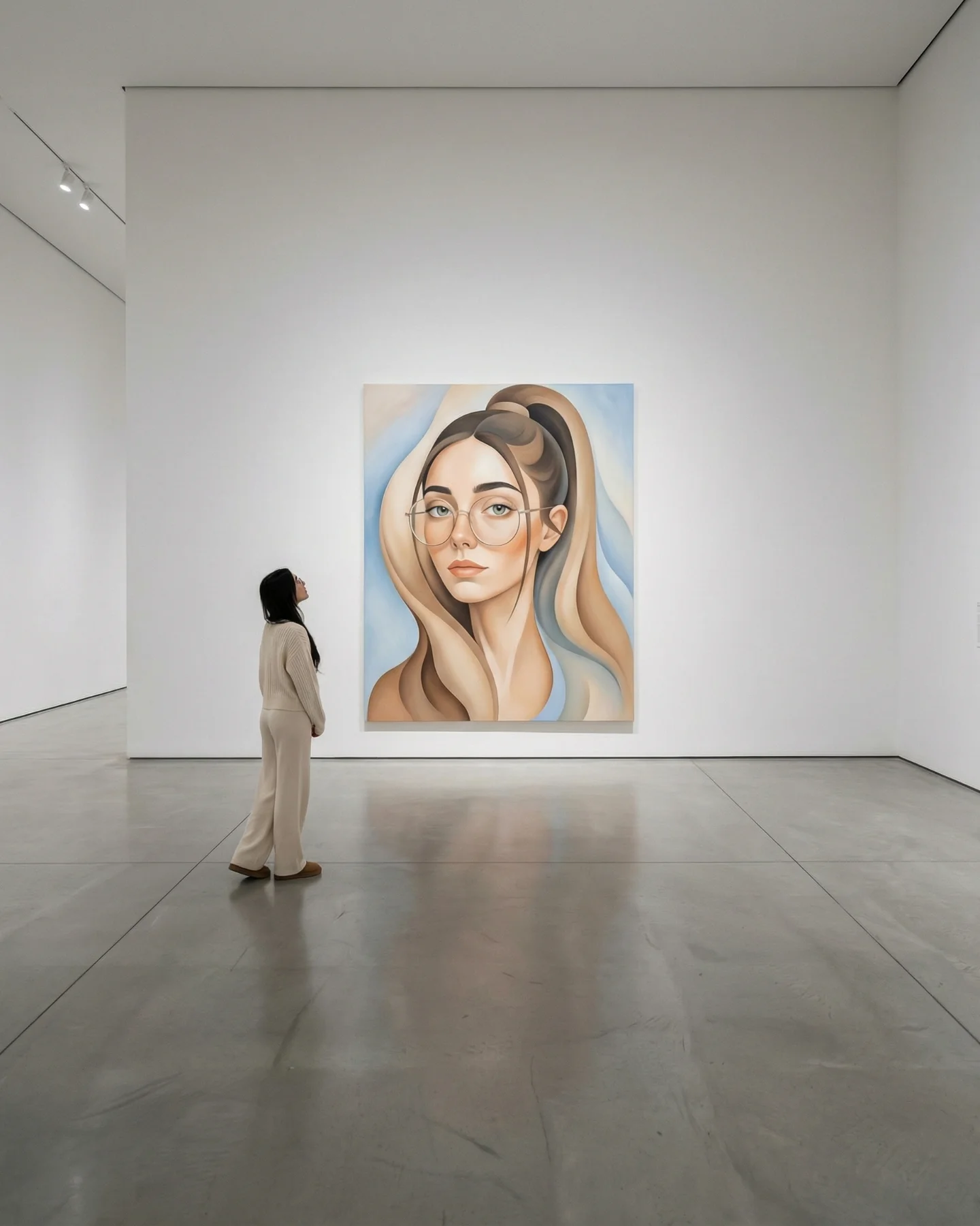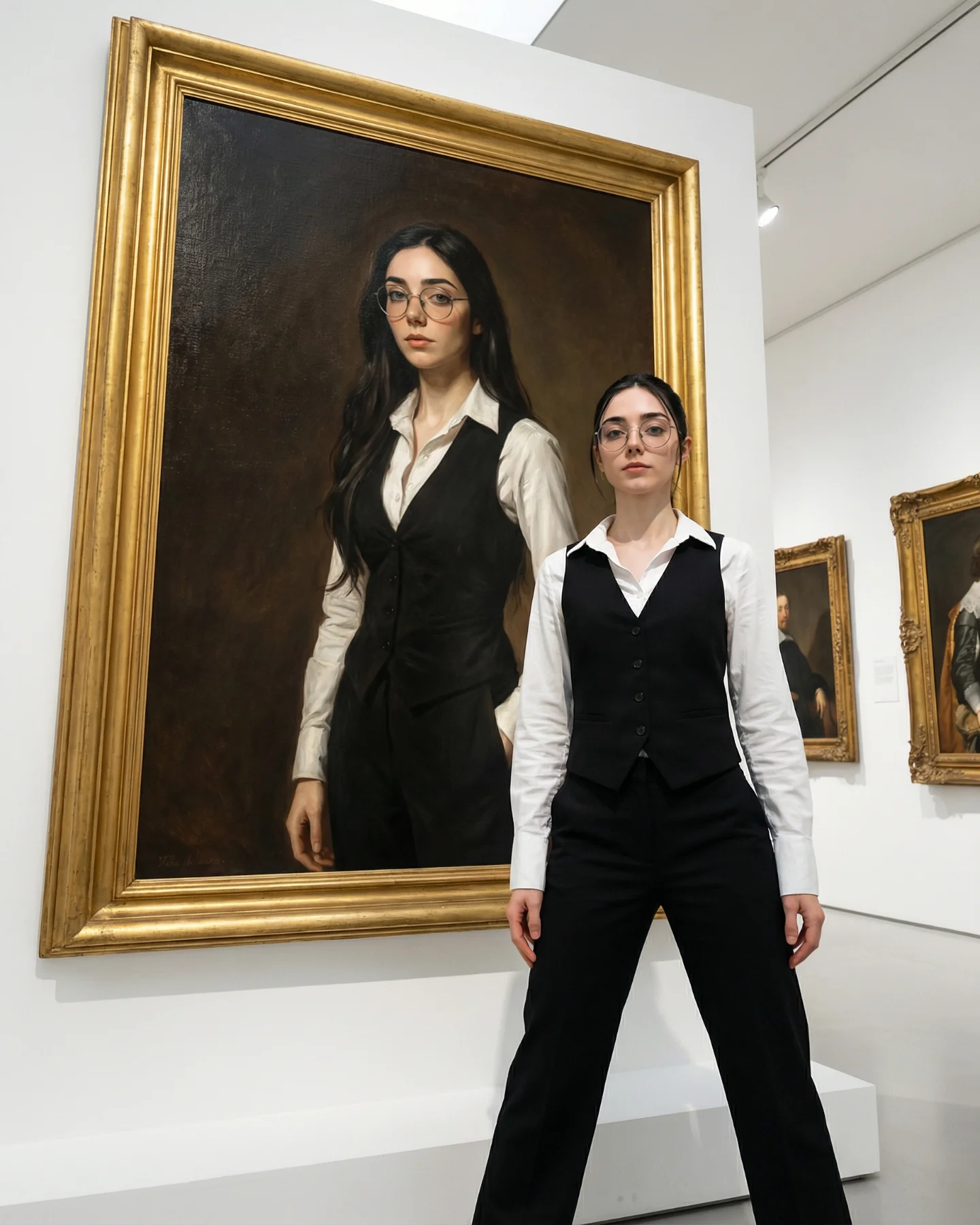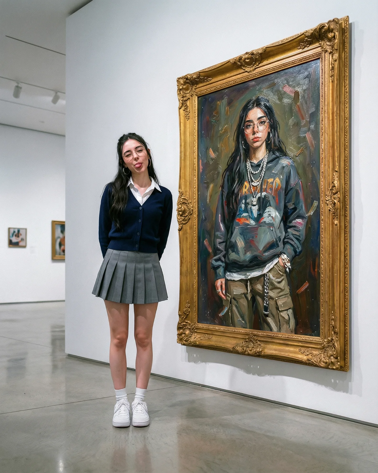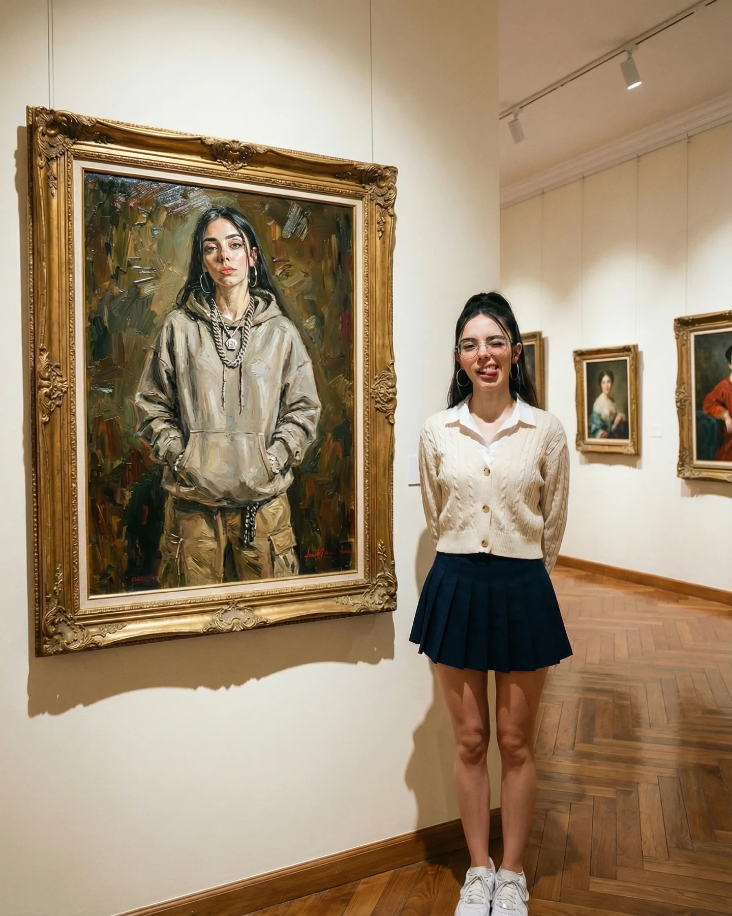 {museum scene} {editorial wardrobe} {frame interaction pose} {luxury mood}{heritage location} {travel outfit} {architectural opening} {cinematic mood}{indoor lifestyle space} {casual outfit} {reflection object} {soft cozy mood}The strongest aesthetic choice is restraint. The palette stays inside warm beige, soft gray, black, white, and old gold. That limited range makes the surreal idea feel polished instead of noisy. The second smart move is the use of full-body framing. You can read the sneakers, legs, skirt silhouette, hoodie volume, and frame scale in one glance, which helps the illusion feel physically credible.