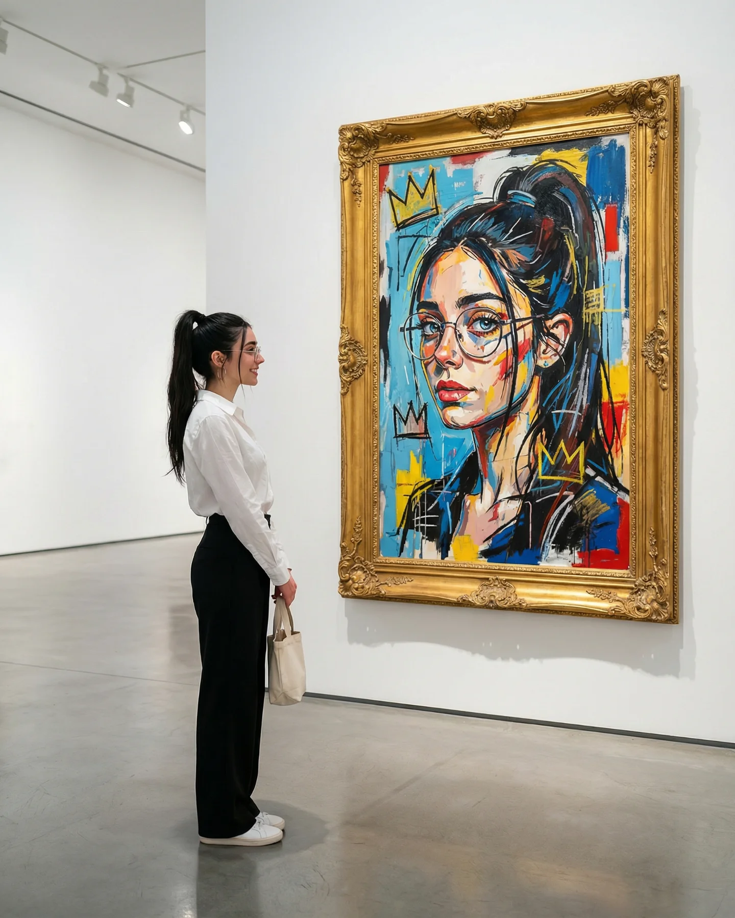 | Warm overhead spotlights with gentle falloff | Keeps the museum believable and gives gold frames dimensionality | Prompt warm gallery track lighting, soft downward shadows, no flash look |