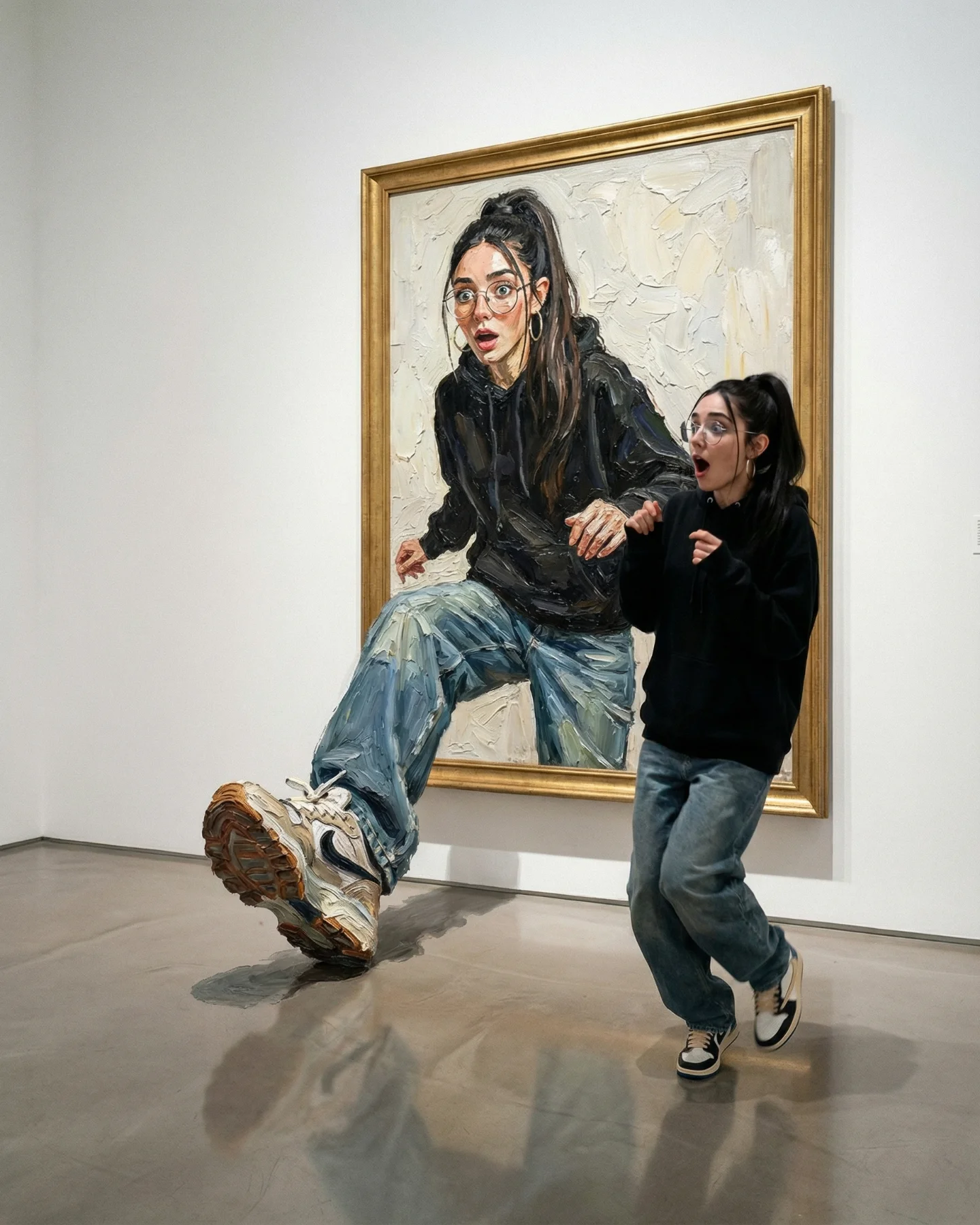 | High contrast between normal and impossible | Casual hoodie-and-sneakers styling inside a formal museum gallery | Everyday wardrobe makes the surreal frame escape feel more surprising and memorable | Keep the clothing casual and realistic while raising the scene concept, not the fashion complexity |