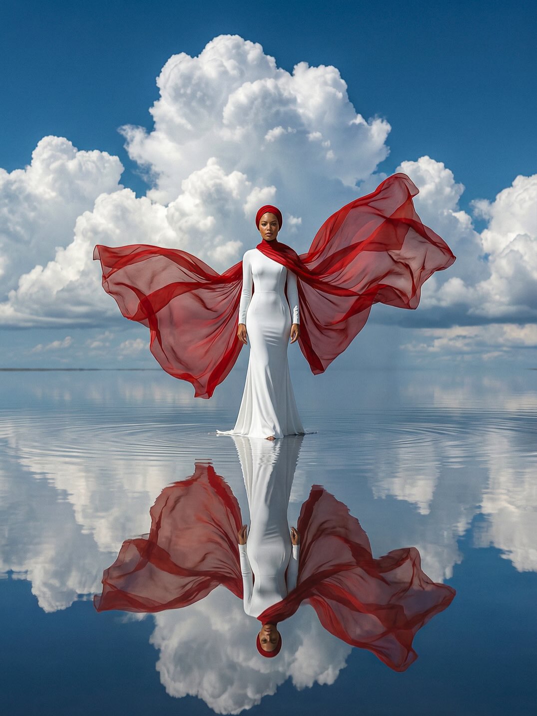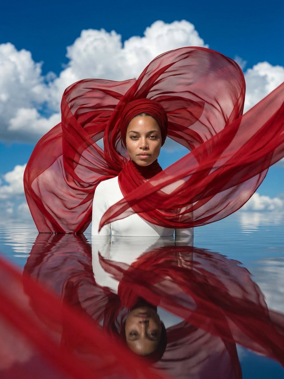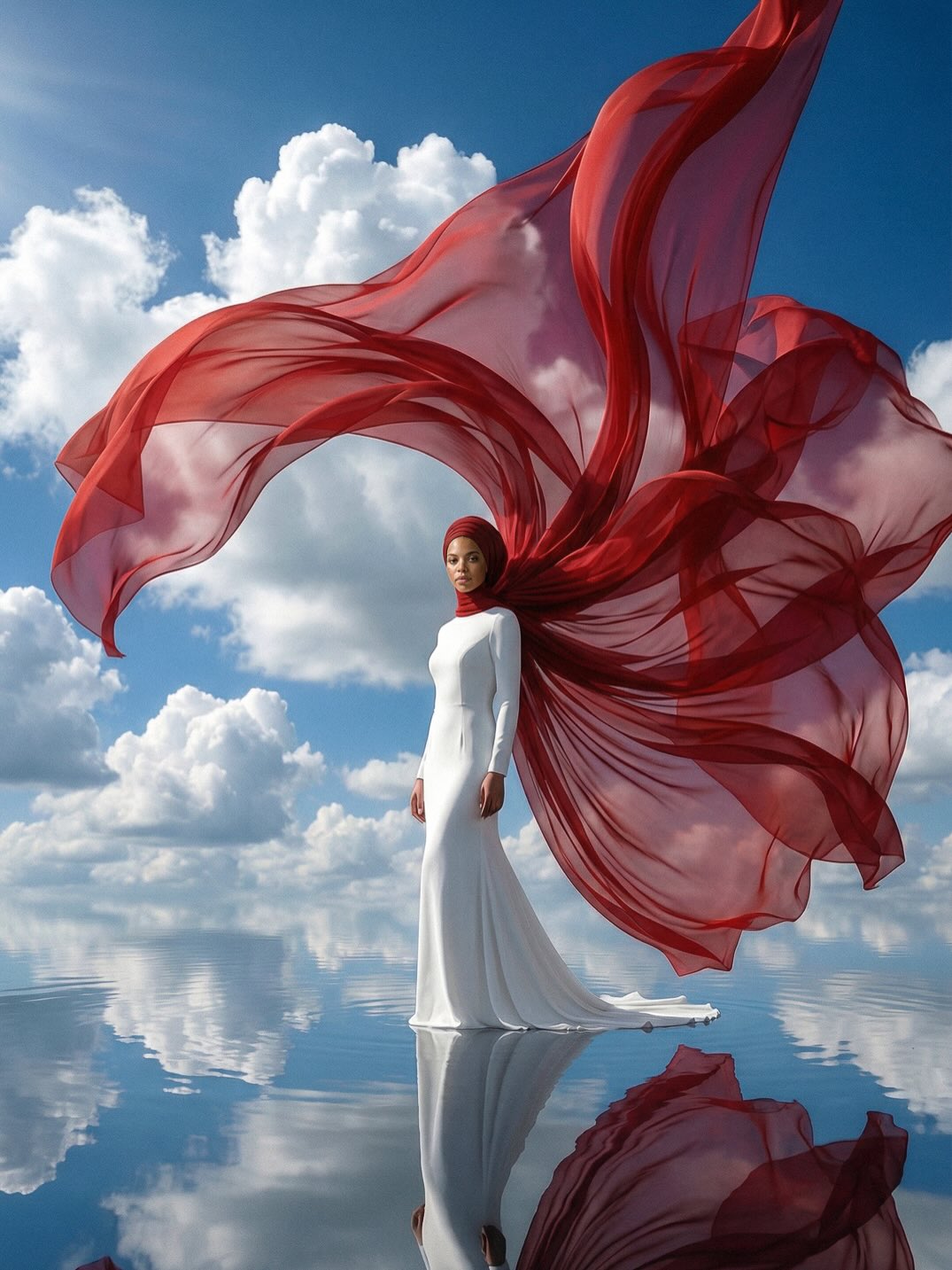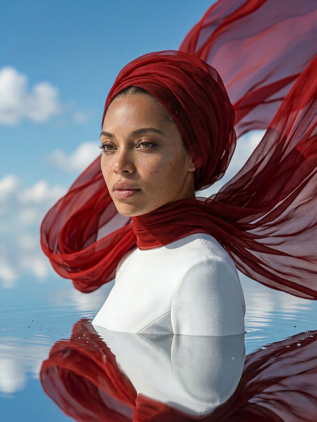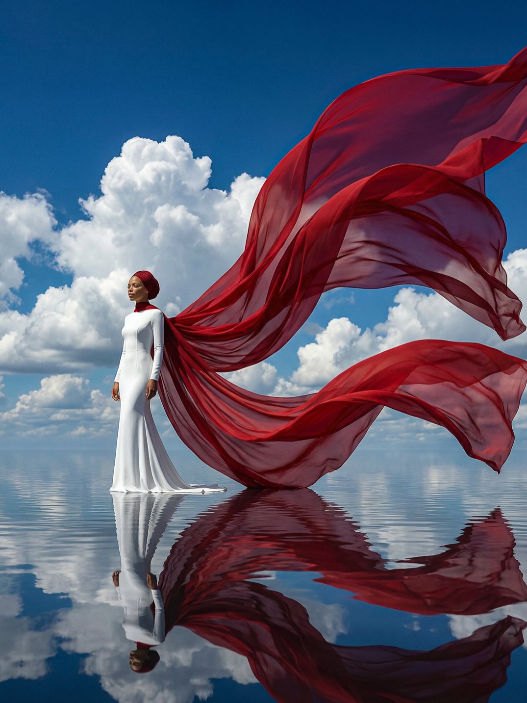 “Create a vertical luxury fashion short set on an endless mirror-water surface under a blue sky with giant white clouds. A poised woman in a clean white floor-length gown wears a deep red wrapped headscarf that extends into a huge translucent veil, billowing into sculptural forms around her. Alternate wide reflective tableaux with intimate portraits, keeping the body still and the red fabric as the main source of movement.”
