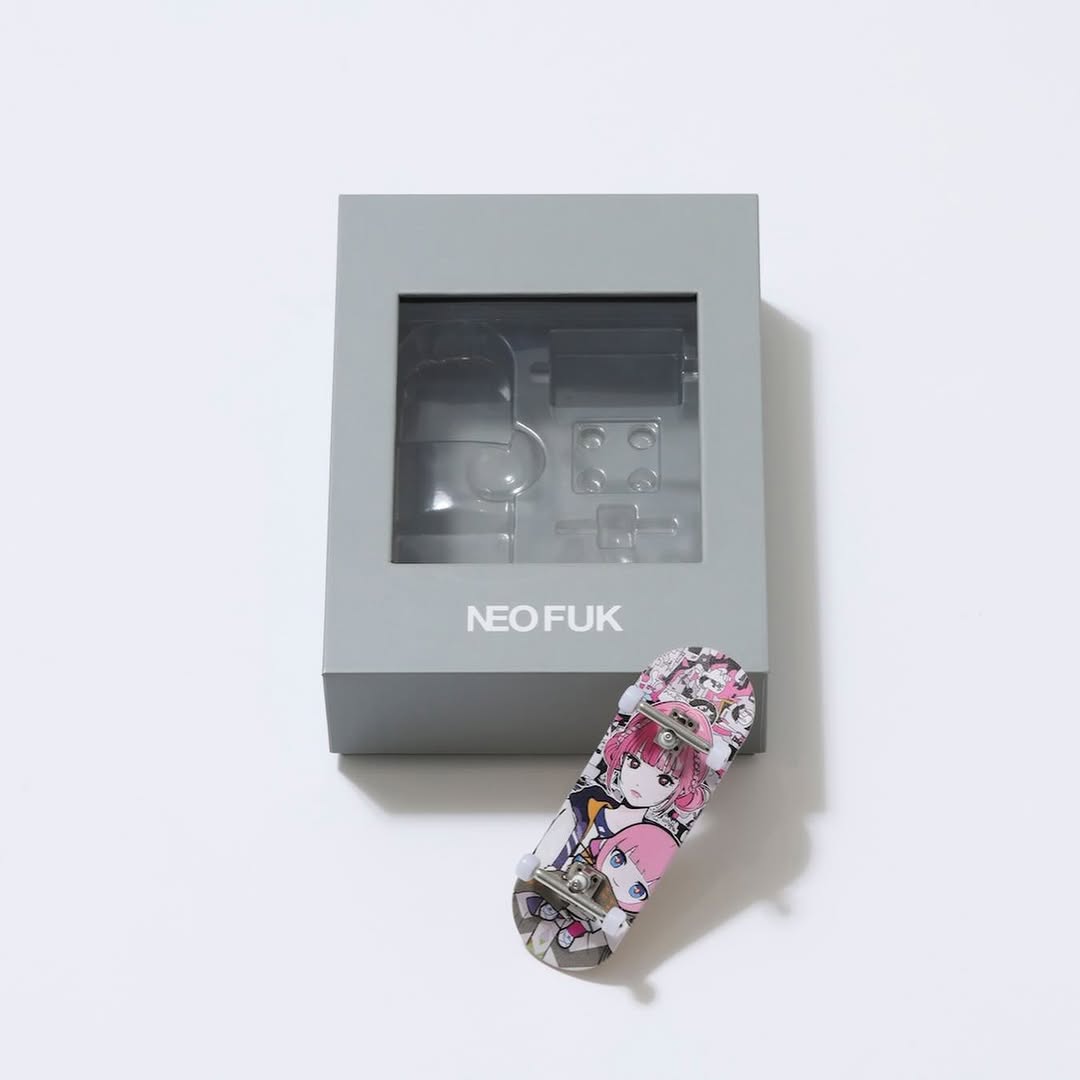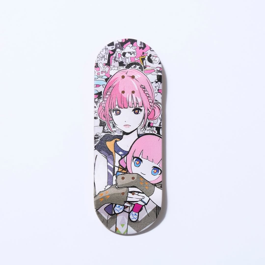 Clean studio product detail photo of a printed anime illustration sheet placed diagonally on a seamless white surface. The artwork shows a pink-haired anime girl holding a small pink-haired doll with big blue eyes, with a dense black-and-white sticker/graffiti collage background and hot pink accents. Top-down flatlay-style angle, square 1:1 crop, crisp focus, visible paper edges with a subtle soft edge shadow. Soft diffuse lighting, minimal shadows, matte print finish, no glare, no props, no hands. Photoreal e-commerce look, high resolution.