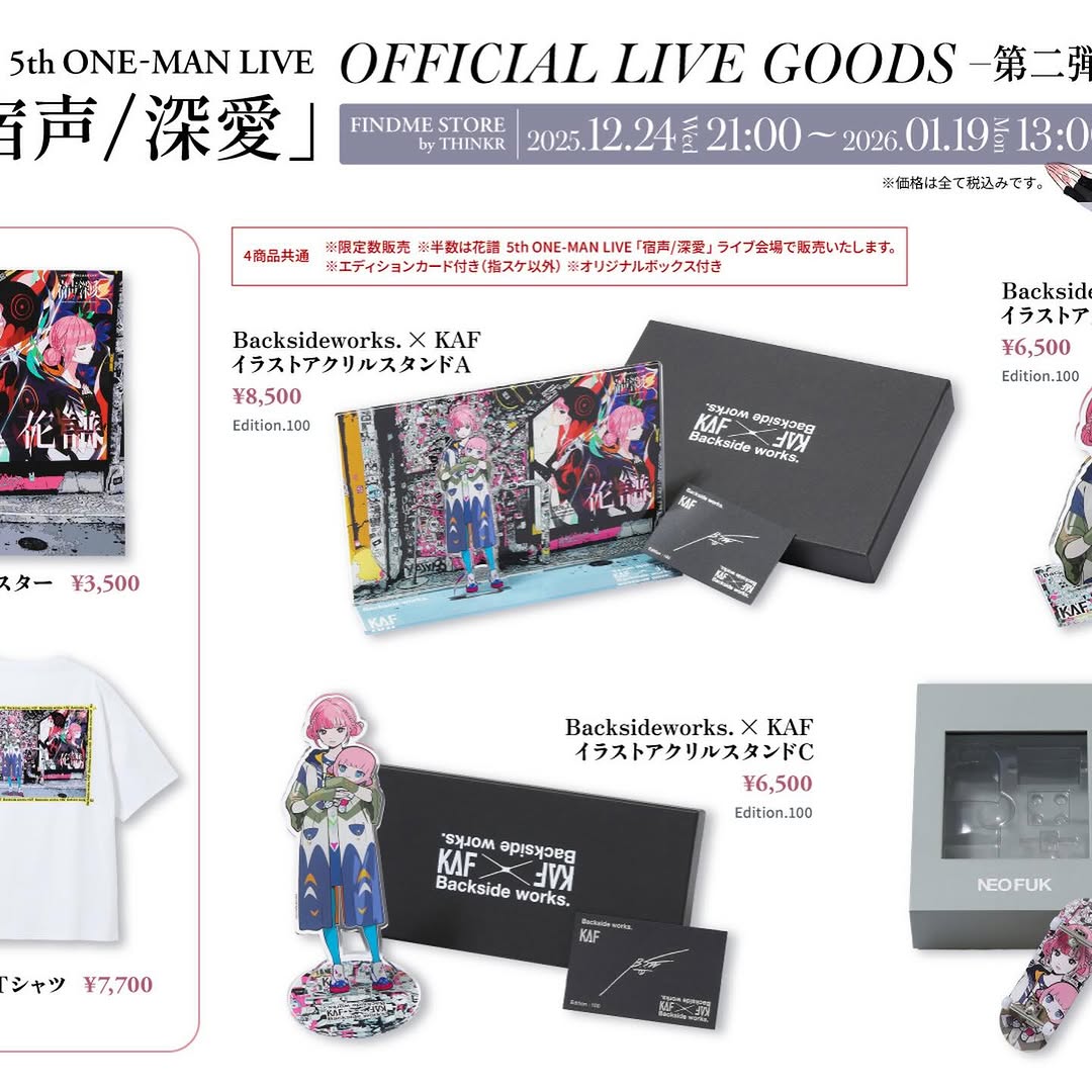 【#花譜5thワンマン グッズ第二弾📢】 花譜 5th ONE-MAN LIVE「宿声 / 深愛」 OFFICIAL LIVE GOODS 第二弾 12月24日(水) 21:00より販売スタート!! 顔や本名、性別、年齢を明かさずに活動する福岡出身の作家Backside works.さんがライブを記念して特別に描き下ろした花譜のイラストを使用したグッズを販売いたします!! 一部商品は数量限定となっております。 予めご了承ください。